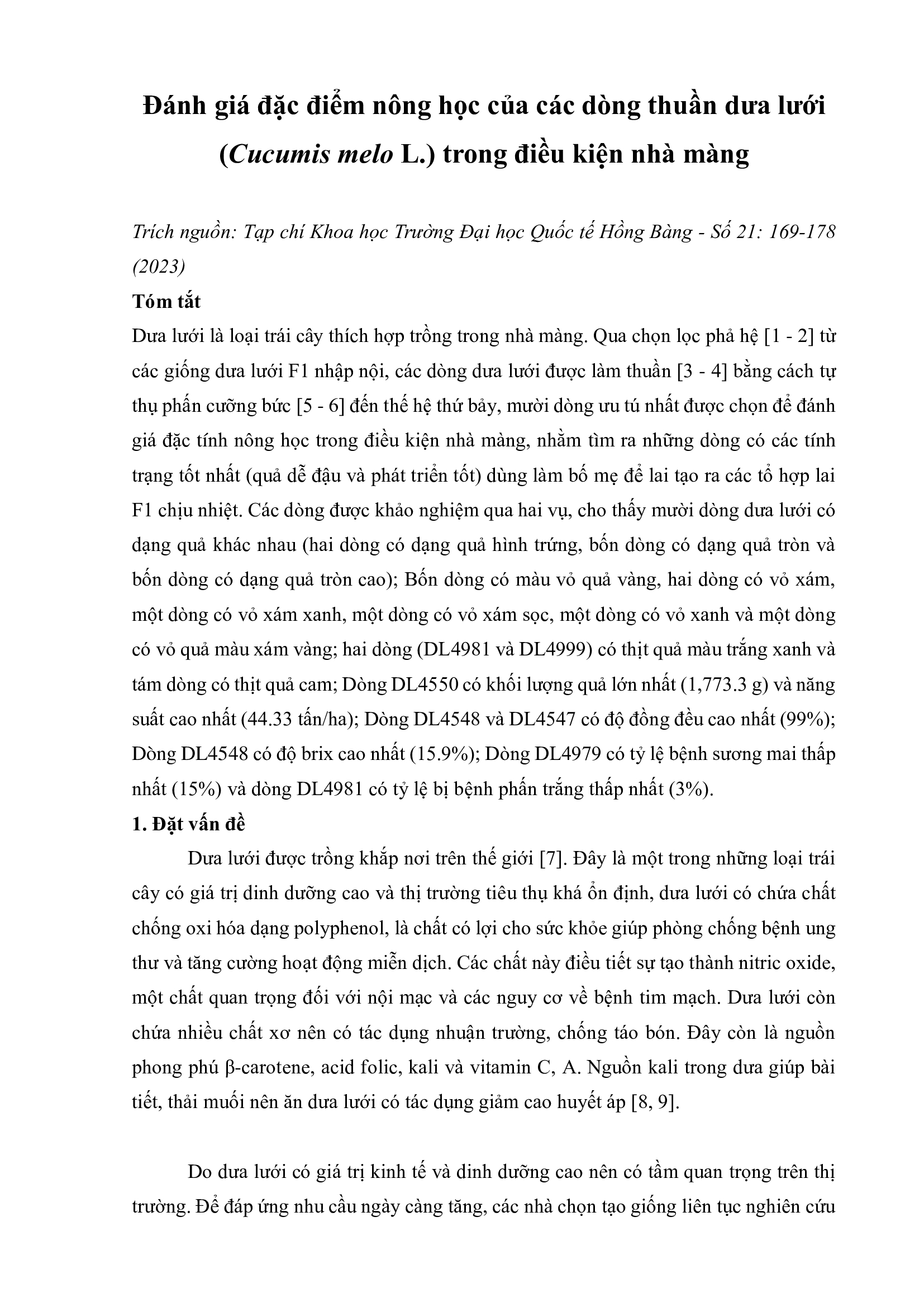 Tin tứcĐánh giá đặc điểm nông học của các dòng thuần dưa lưới (Cucumis melo L.) trong điều kiện nhà màng