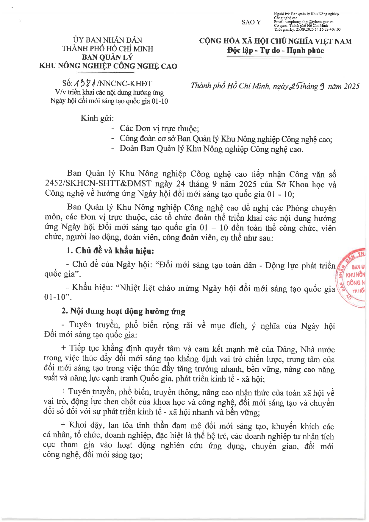 Tin tứcTrung tâm Nghiên cứu và Phát triển Nông nghiệp Công nghệ cao triển khai các nội dung hưởng ứng Ngày Hội đổi mới sáng tạo quốc gia 01-10