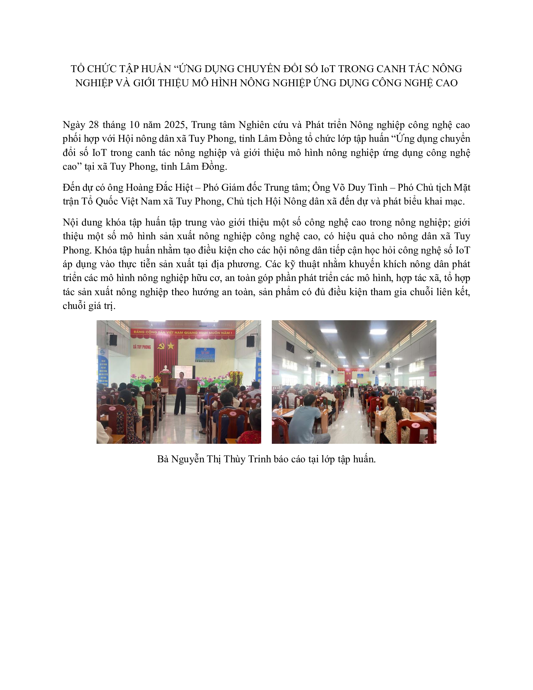 Tin tứcTỔ CHỨC TẬP HUẤN “ỨNG DỤNG CHUYỂN ĐỔI SỐ IoT TRONG CANH TÁC NÔNG NGHIỆP VÀ GIỚI THIỆU MÔ HÌNH NÔNG NGHIỆP ỨNG DỤNG CÔNG NGHỆ CAO