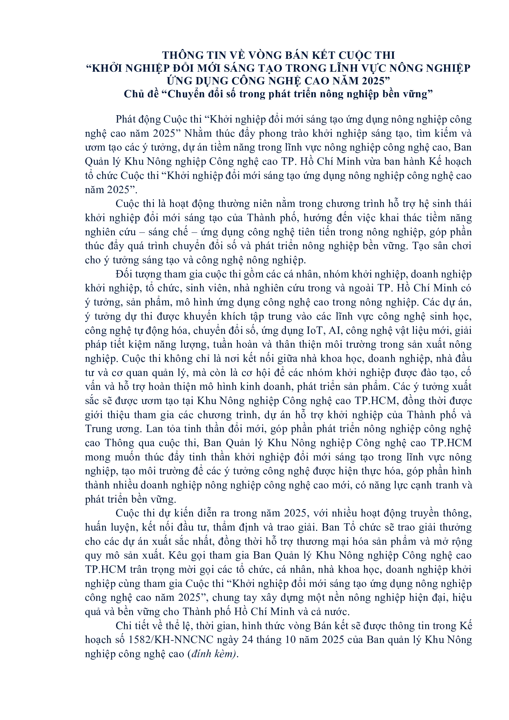 Tin tứcTHÔNG TIN VỀ VÒNG BÁN KẾT CUỘC THI “KHỞI NGHIỆP ĐỔI MỚI SÁNG TẠO TRONG LĨNH VỰC NÔNG NGHIỆP ỨNG DỤNG CÔNG NGHỆ CAO NĂM 2025” Chủ đề “Chuyển đổi số trong phát triển nông nghiệp bền vững”
