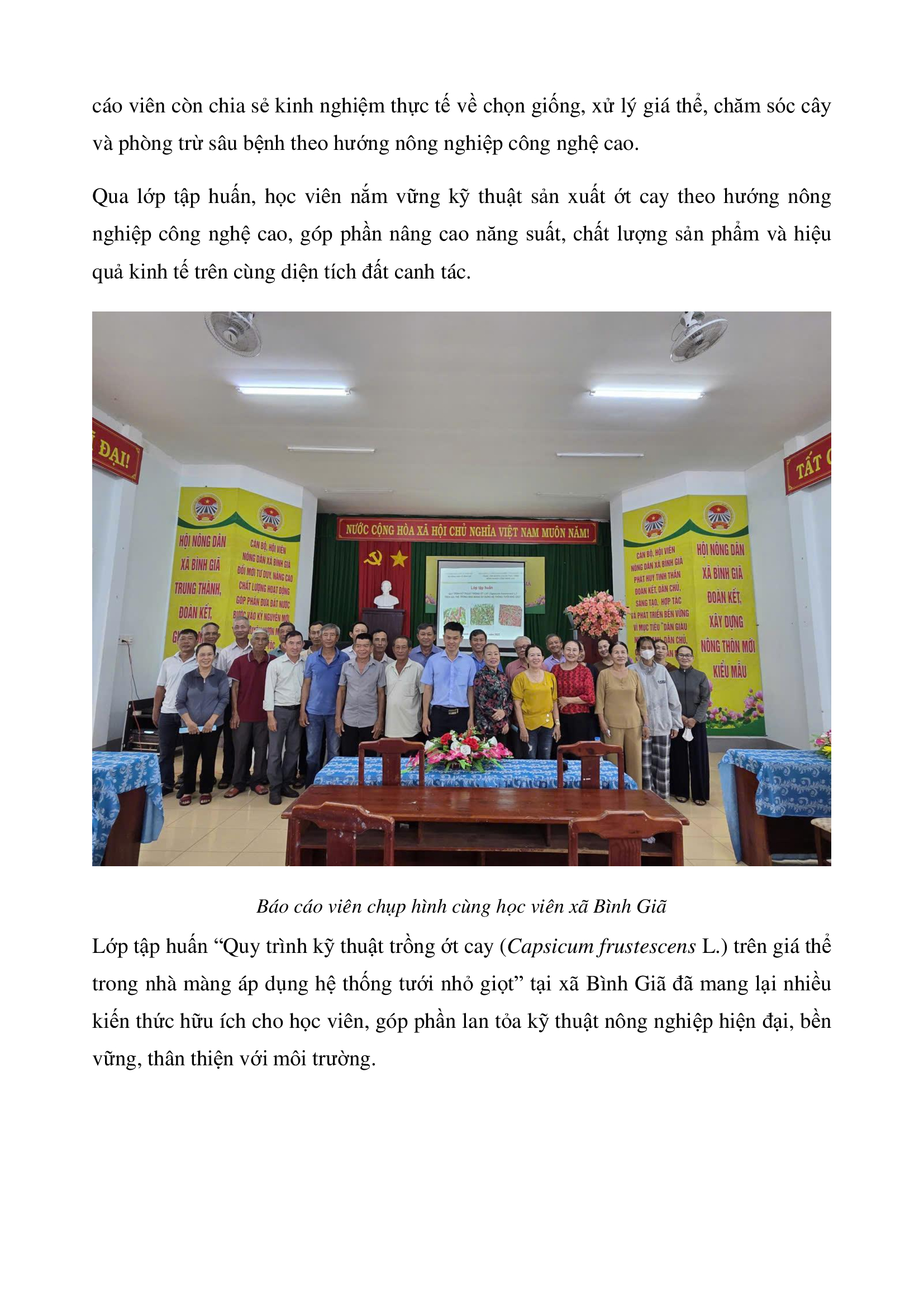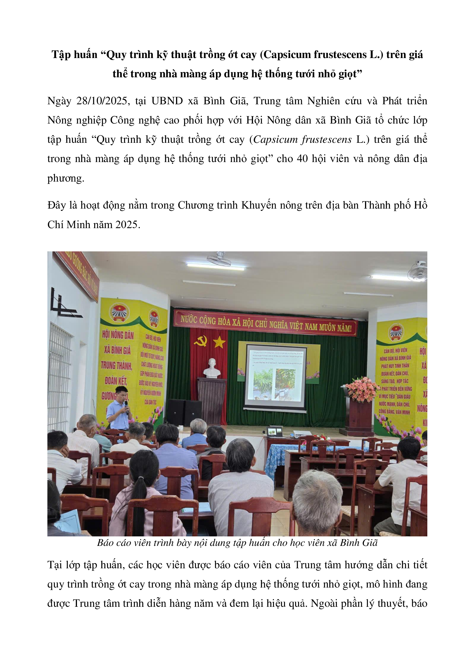 Khoa học cây trồng, Rau ăn quả, Tin tức, Tư vấn - Đào tạoTập huấn “Quy trình kỹ thuật trồng ớt cay (Capsicum frustescens L.) trên giá thể trong nhà màng áp dụng hệ thống tưới nhỏ giọt”