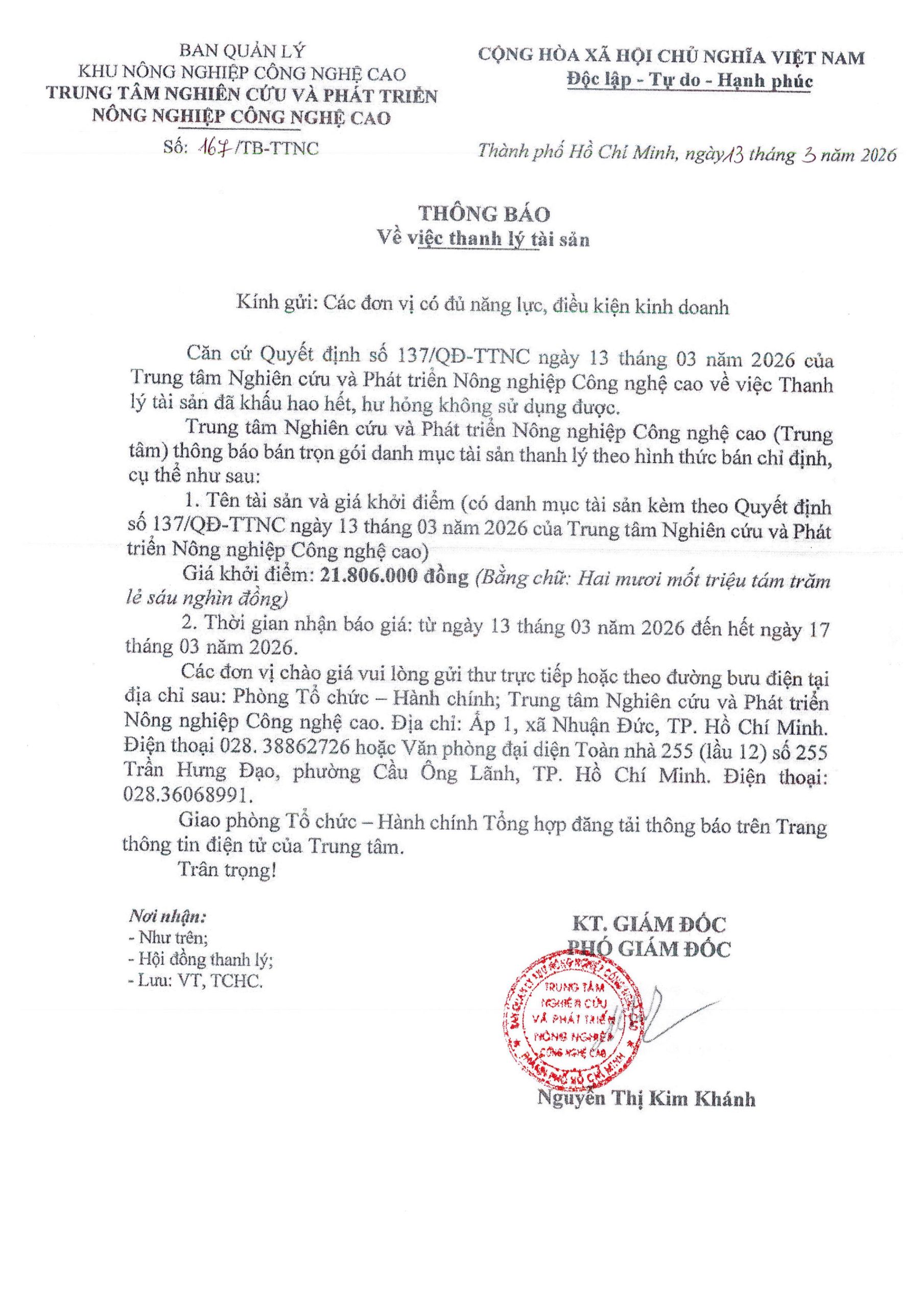 Thông báo về việc thanh lý tài sản