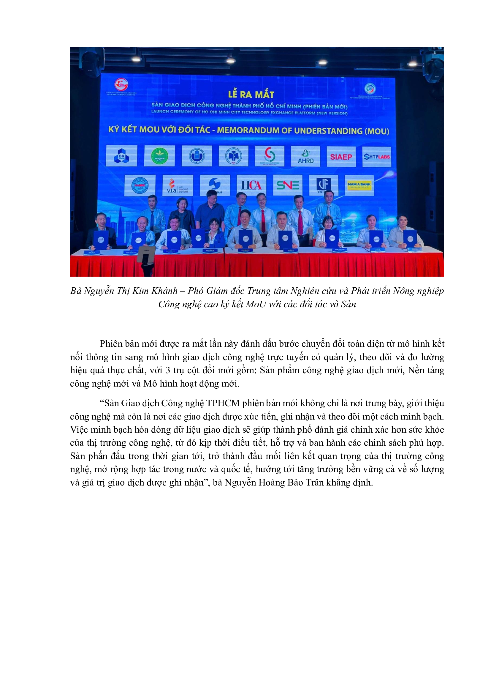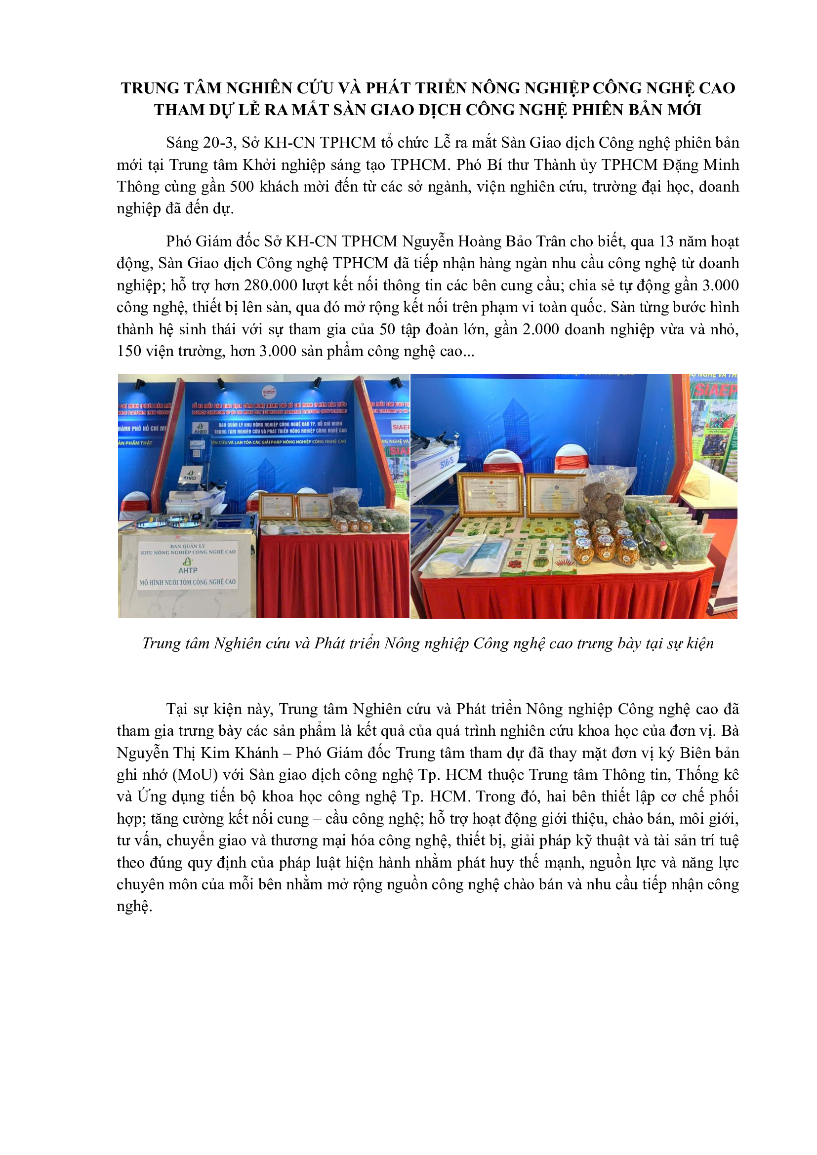 Hợp tác, Tin tứcTRUNG TÂM NGHIÊN CỨU VÀ PHÁT TRIỂN NÔNG NGHIỆP CÔNG NGHỆ CAO THAM DỰ LỄ RA MẮT SÀN GIAO DỊCH CÔNG NGHỆ PHIÊN BẢN MỚI